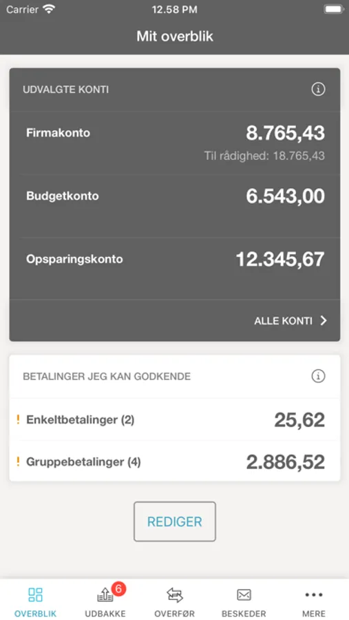 Erhverv Mobilbank giver dig overblik over virksomhedens konti, samt mulighed for at oprette og godkende betalinger på farten.