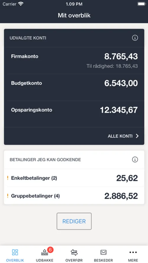 Hvidbjerg Mobilbank Erhverv giver dig overblik over virksomhedens konti, samt mulighed for at oprette og godkende betalinger på farten.