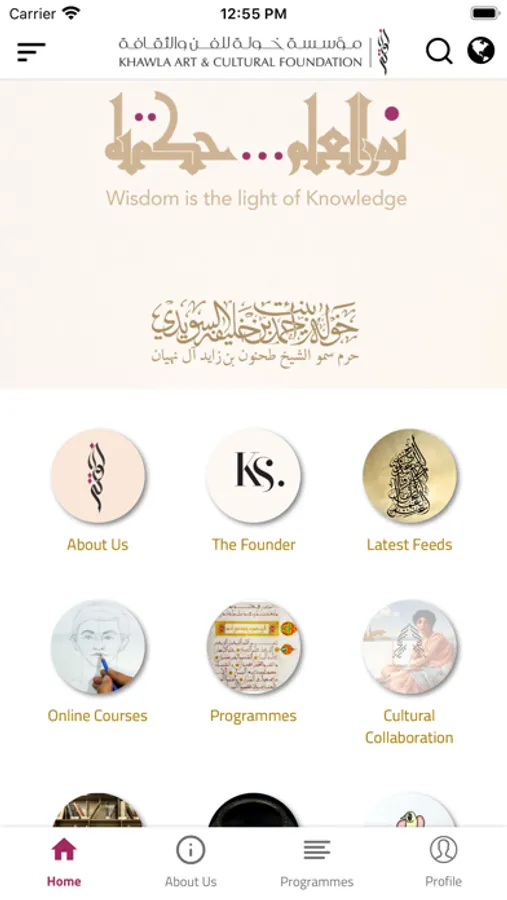 Khawla Art & Cultural Foundation,founded by Her Highness Sheikha Khawla bint Ahmed Khalifa Al Suwaidi, wife of His Highness Sheikh Tahnoun bin Zayed Al Nahyan, National Security advisor, U.A.E, strives to motivate and to inspire the creativity of upcoming talents The foundation activates interest in classic arts of all kinds and focuses on reviving the art of Arabic calligraphy in all its schools and directions and is keen to spread knowledge related to all types and schools. . It seeks to cultivate young talents and supplement them with all new knowledge, in terms of thought, art and culture.