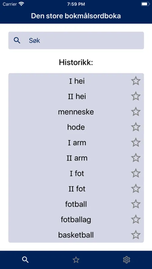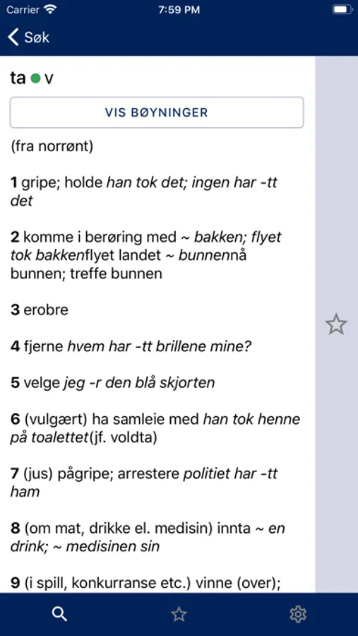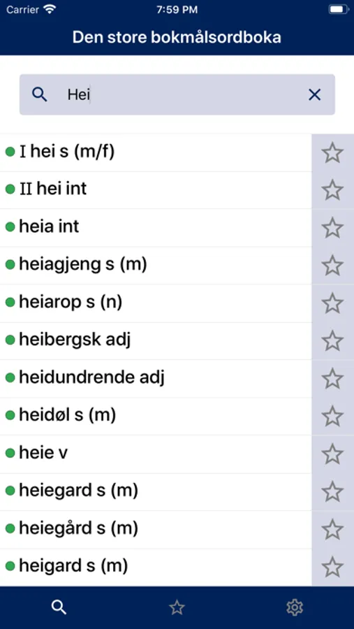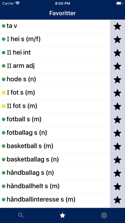 samtlige oppslagsord er forsynt med en fargekode. Ord merket med grønt angir at det er