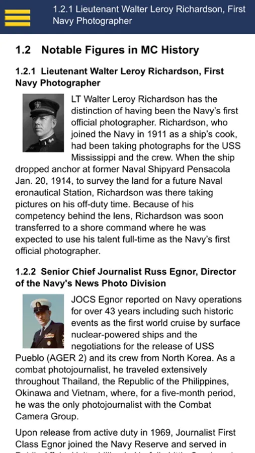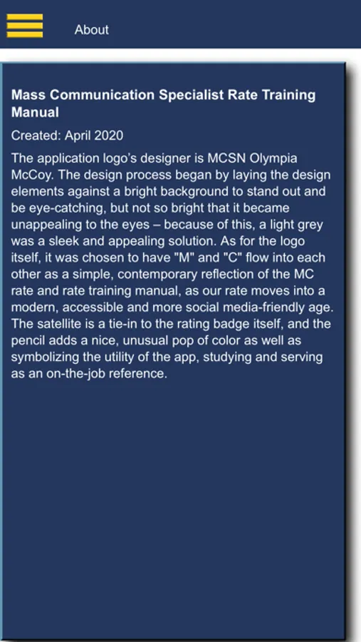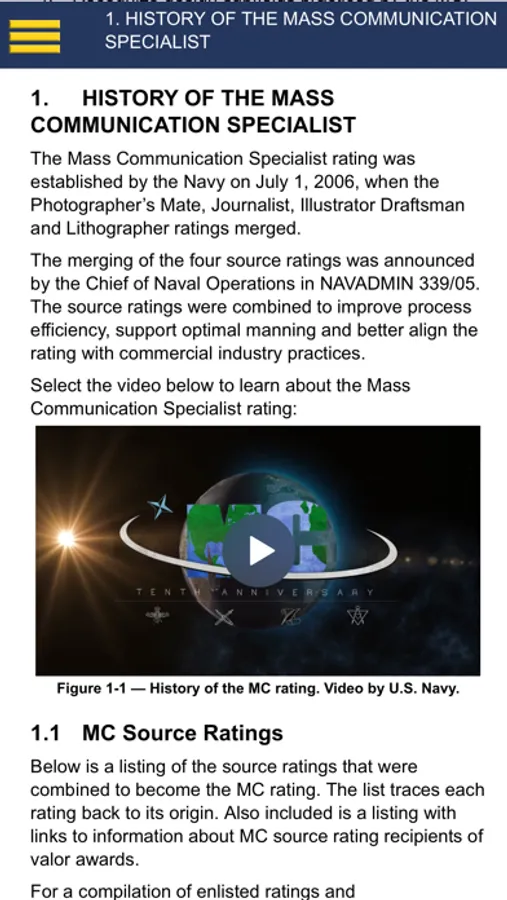 This app features guides that are integral to an MC as they are required to practice human-centered design to develop creative communication solutions and align communication strategies and tactics to leadership’s intent; conduct research and develop audience profiles; prepare, process, and print publications and media products; create sketches, storyboards, and graphics; design publications; produce still imagery and written, audio, video, and multimedia information products; collect, analyze, and report media project and communication plan feedback and performance information; create media project plans; conduct community outreach, news media operations, leadership communication operations, and organizational communication operations; plan and direct communication campaigns and events and serve as communication advisors to commanders; and develop content strategies, create data stories, and ensure communication products and experiences are designed to enhance understanding and discoverability.