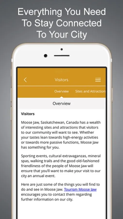 With features like City Council & Committees, Visitors,Maps, News, Calendar, and Report an Issue you'll find it easier than ever to stay connected with the City of Moose Jaw with just a few taps on your mobile device.