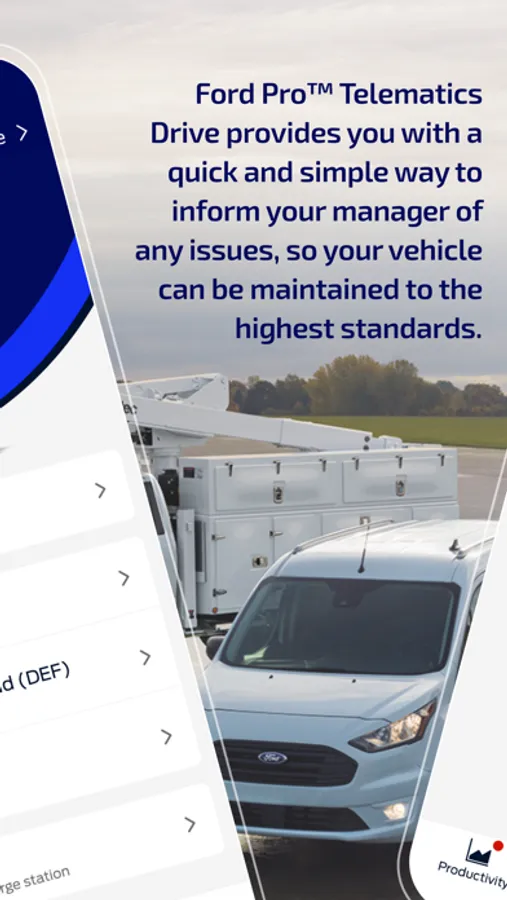 As a busy driver of a company fleet vehicle, having a well-maintained vehicle is critical to ensuring you can complete your jobs on time. Ford Pro Telematics™ Drive is designed to help you do just that. By providing you with a quick and simple way to inform your manager of any issues, your vehicle can be maintained to the highest standards.