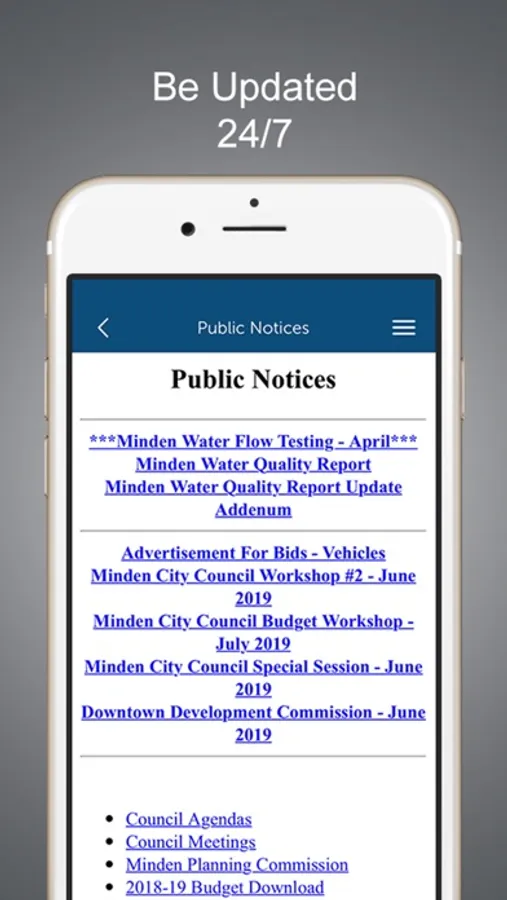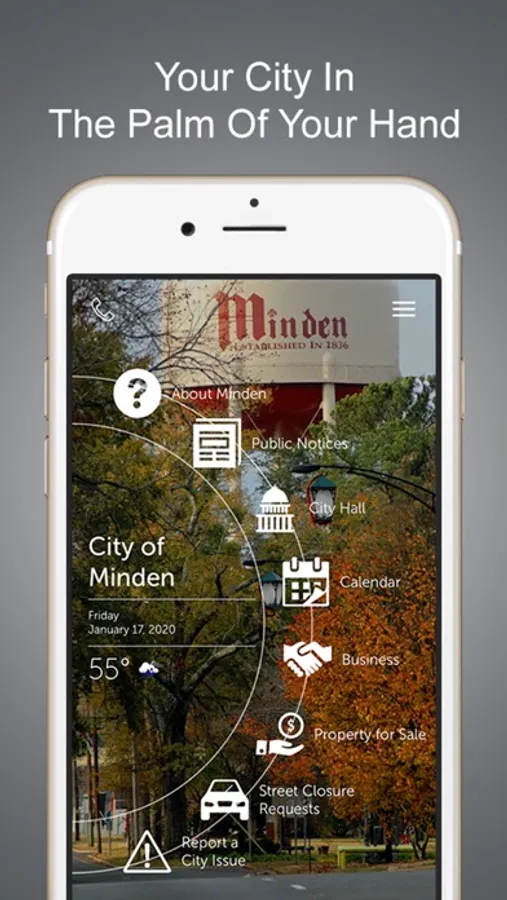 With features like About Minden, City Hall, Calendar, Public Notices, Business, and Report a City Issue, you'll find it easier than ever to stay connected with the City of Minden with just a few taps on your mobile device.
