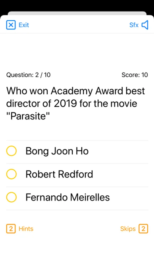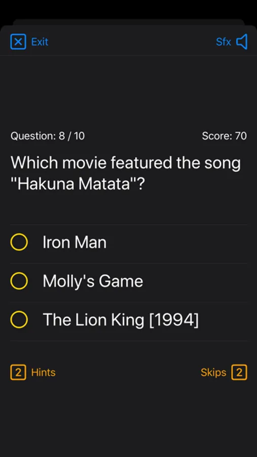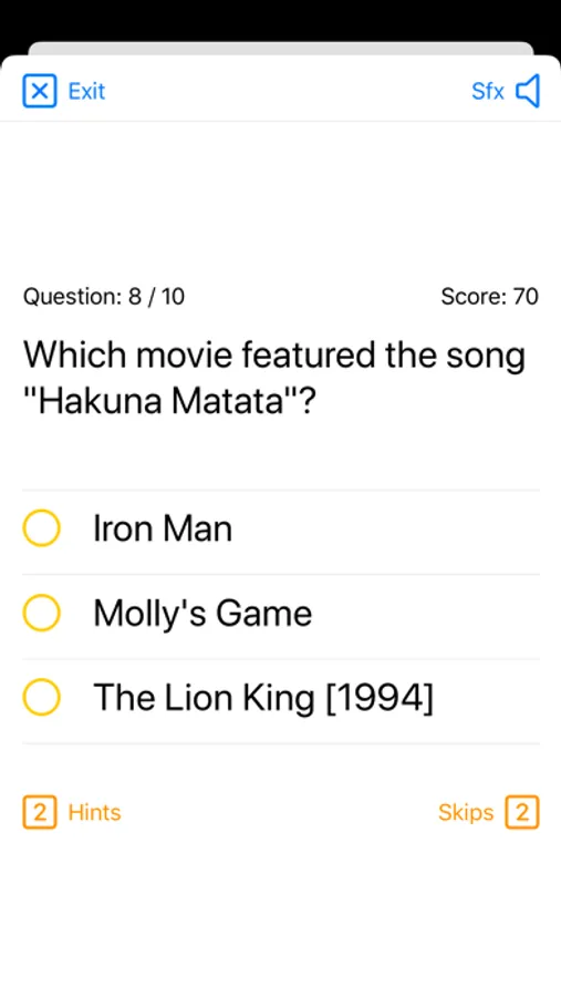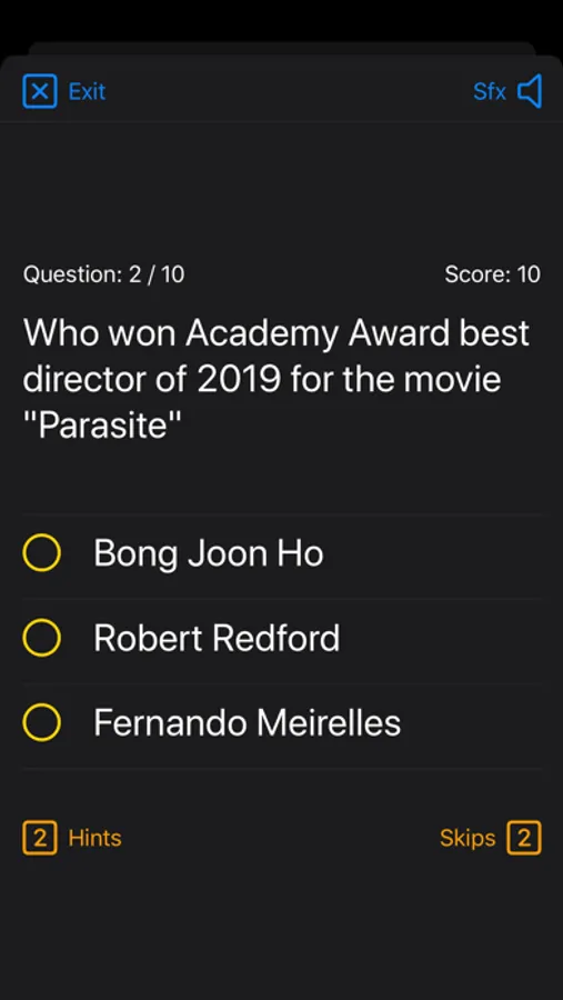 Cinema Trivia 2 (CT2) tests your knowledge on movies and stars with simple and straight forward game play: 10 questions with limited hints & skips, bonus points for good performance, and special wager on final question.