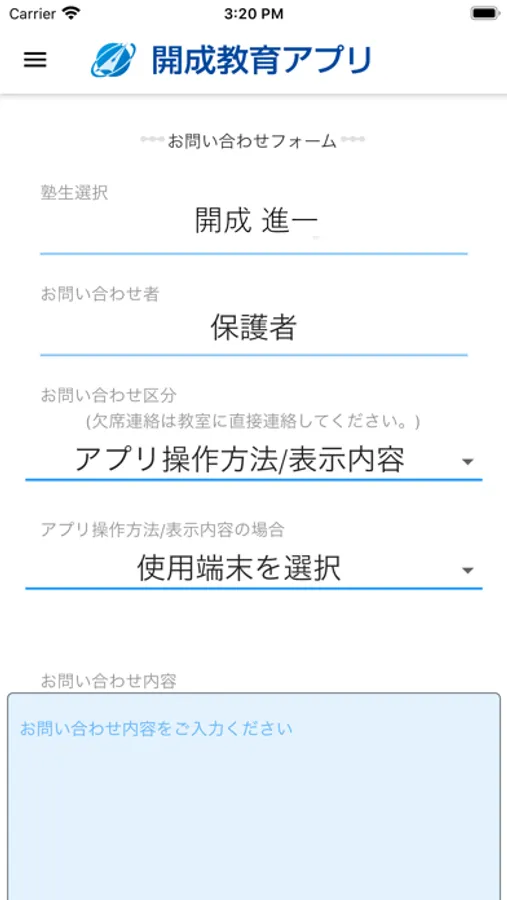 「お問い合わせ」画面を通じて、アプリの操作方法や学費の確認などの質問や、授業やイベントへの疑問など、お気軽にお問合せいただくことができます。