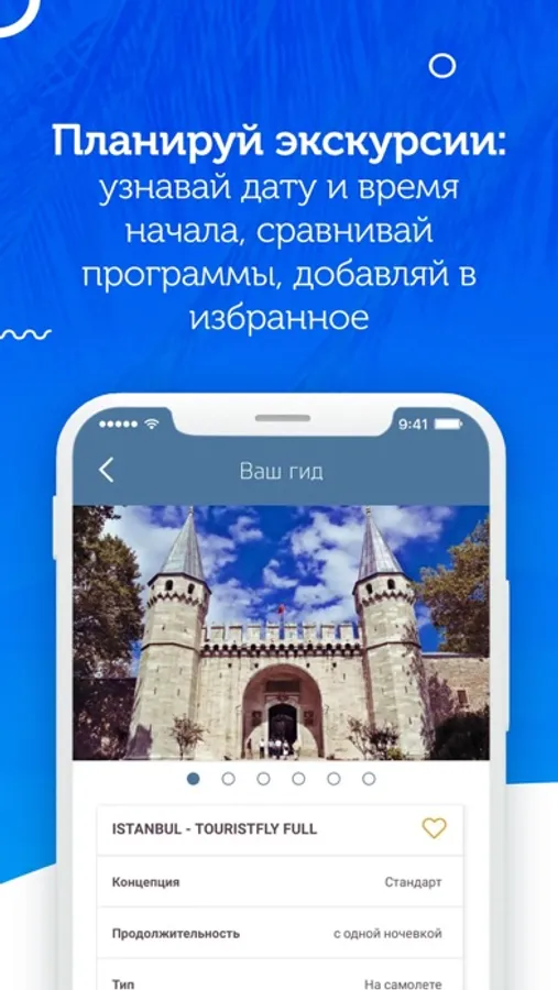 • Excursions. Explore the available excursions in the country of your vacation, find out the program and possible dates of the trip and add the excursions to the "Favorites".