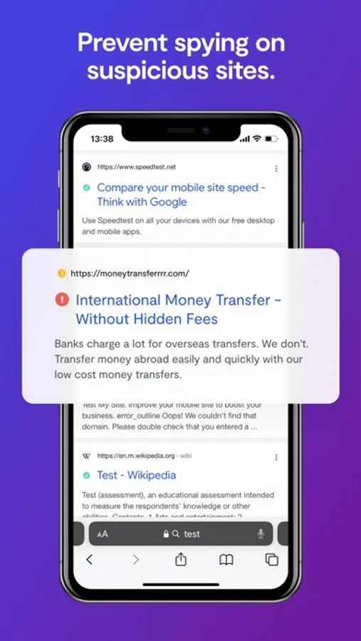 Learn which sites are safe before you open them. See fraudulent, malicious, or spam links in your search results. Automatically block unprotected sites. Safari extension available for iOS 15 users