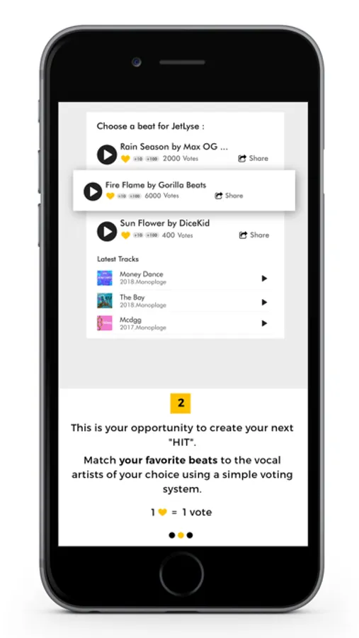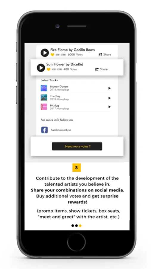 Through its process, the platform aims to democratize the music industry by giving power and decision to the consumer. The people who participate, coming from a large cluster of people with different backgrounds, will collectively vote on which artist they want to see succeed and on which instrumental composition they think will best fit.