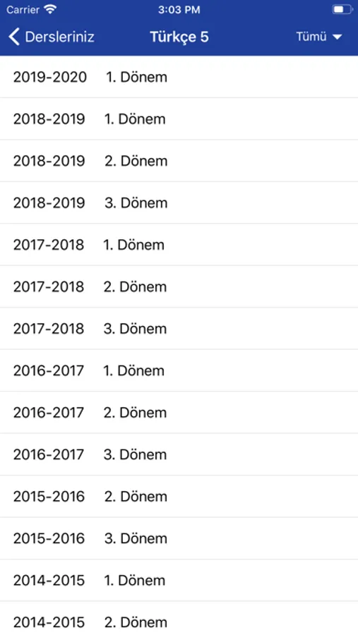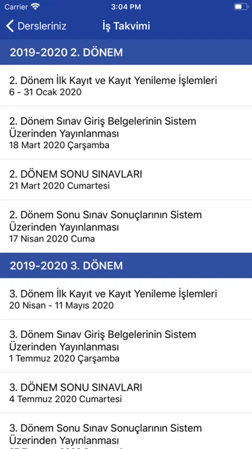 - Yıllarına göre sınav listesi.
