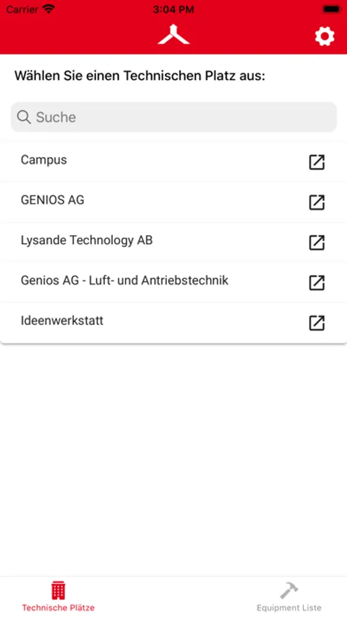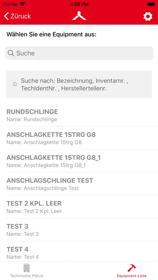 Die Auswahl des Equipments zur Inventarisierung kann sowohl über die Unternehmensstruktur als auch über eine Equipmentliste des Unternehmens erfolgen. Zusätzlich besteht eine direkte Suchmöglichkeit über die integrierte Volltextsuche