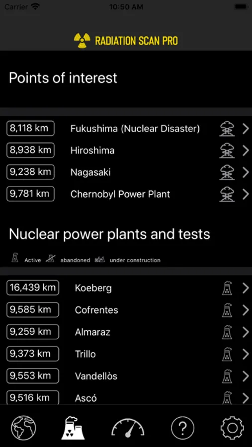 Through the Google map, you will be able to see the active nuclear power plants and all the detailed data of each individual power plant with the distance from your position.