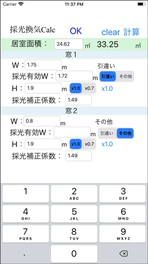 建築基準法により定められた住居系の『居室』を満たすための『採光』『換気』を計算するアプリ。