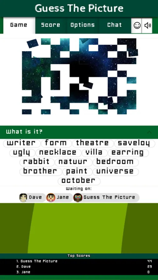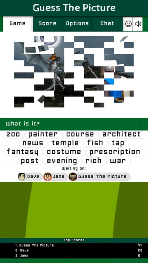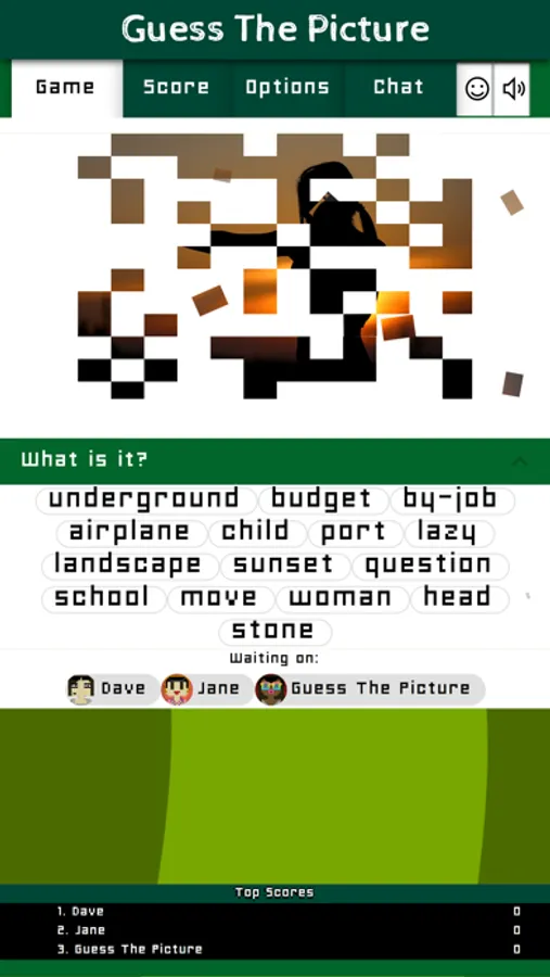 Guess The Picture is a multiplayer game that brings the most fun when you play it in the same room with your friends. Each round everyone sees a photo appearing everyone has to click no the right word that describes it.