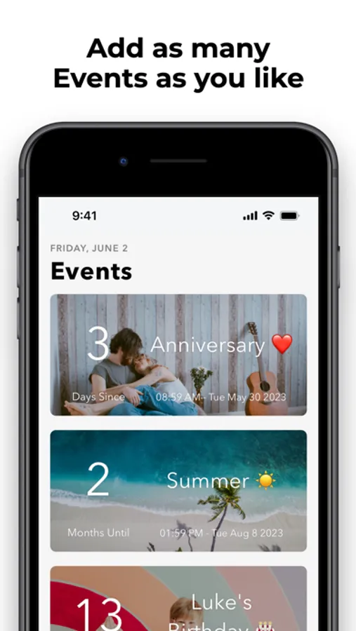 Keep track of your important events, whether you're counting down to a vacation or celebrating your wedding anniversary.