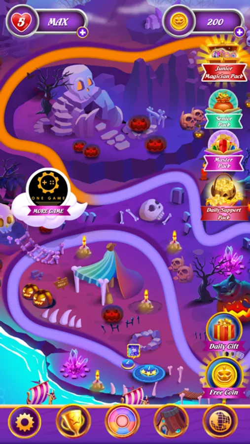 Explore the magical world of Magic Jewels Legend: Match 3 Games includes the Witch city, magic school, castle, hills, waterfall, cemetery, haunted house, graveyard, island, cave…