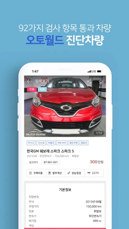 도이치 오토월드가 진단하는 92가지 항목(국토부 성능검사 15가지 기본 항목 포함)을 모두 통과한 차량을 제공합니다.