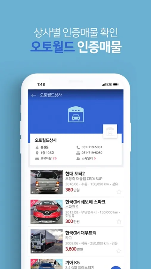 도이치오토월드 전용 어플리케이션으로 차량검색, 차량입출고, 상사현황, 시설현황 및 차량관리까지 원스톱으로 이뤄지는 원스톱 통합관리시스템이 적용됩니다.