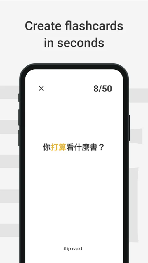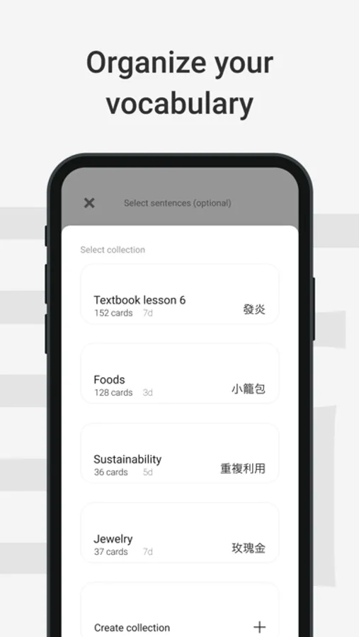 Serica comes with a built-in Chinese / English dictionary which means you can create flashcards from any word definition or example sentence. In just a few taps you can create a flashcard and add it to the collection of your choice.