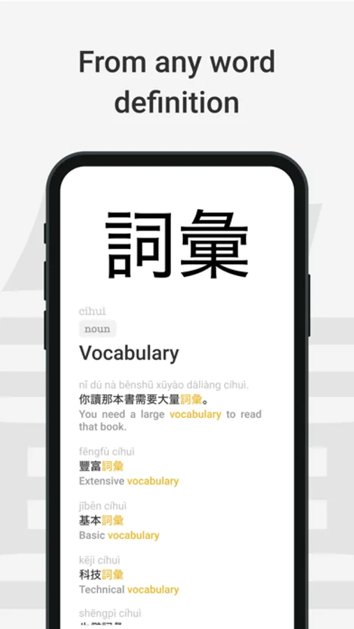 Look up Chinese words using English, Pinyin, or Chinese and discover key example sentences for more context. Context is key when learning new vocabulary and ways to express yourself in a foreign language.