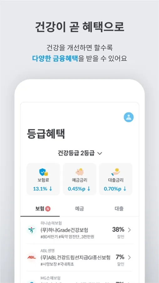 건강을 개선하면 할수록 다양한 금융혜택을 받는다! 등급혜택 탭의 금융상품들을 보며 내 건강등급은 어느 정도의 혜택을 받을 수 있는지, 개선 후에는 얼마나 더 많은 혜택을 받을 수 있는지도 확인해 보세요.