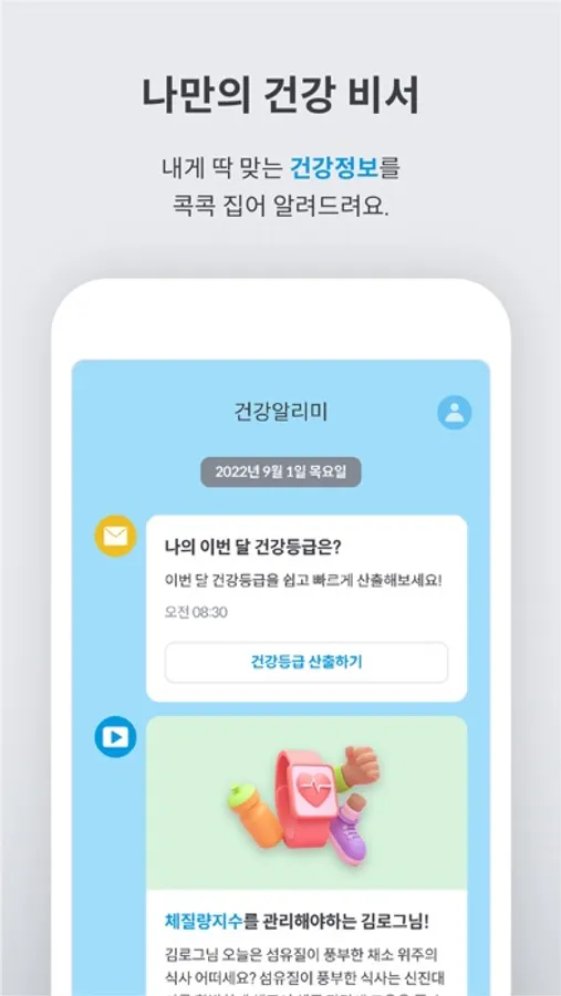 내게 딱 맞는 건강정보를 매주 콕콕 집어 알려드립니다. 나는 건강상으로 어떤 부분이 취약한지, 지금 내게 필요한 건강 정보와 운동은 무엇인지 궁금하시지 않나요?