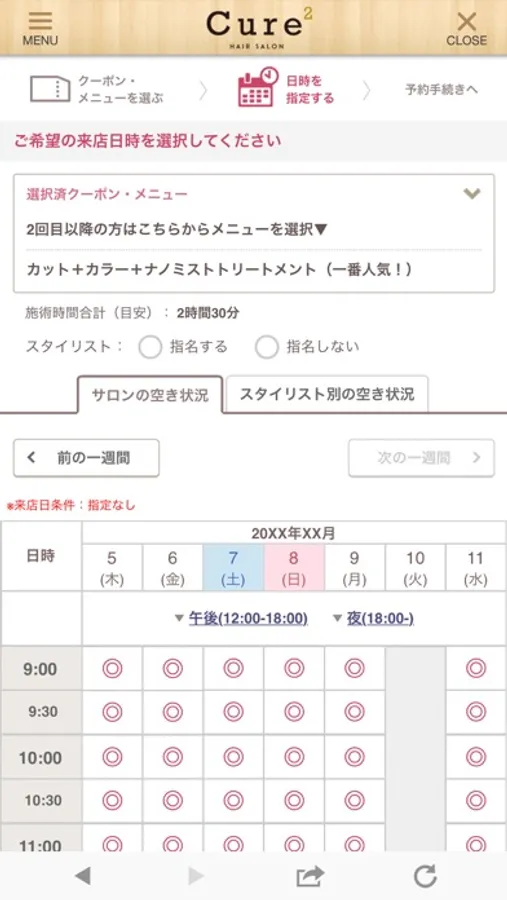 ご希望のメニュー・日時を指定して送信するだけでご予約いただけます。