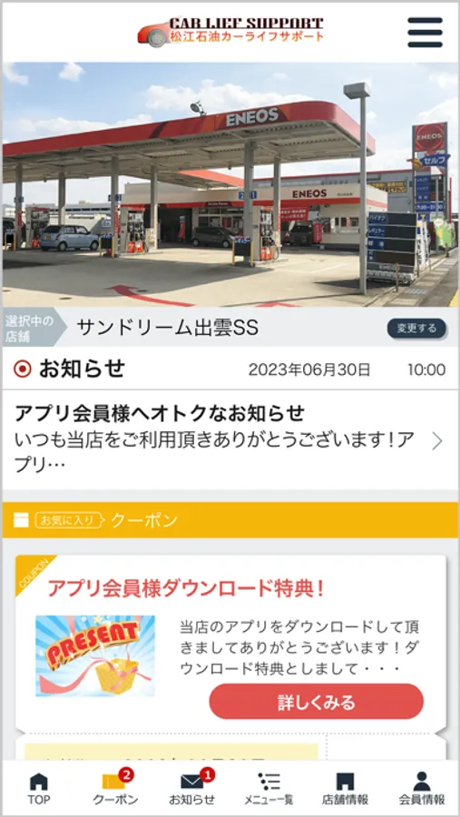 「松江石油カーライフサポート」のダウンロード・ご利用は無料です。アプリダウンロード後にご希望の店舗をご登録の上、ご利用ください。