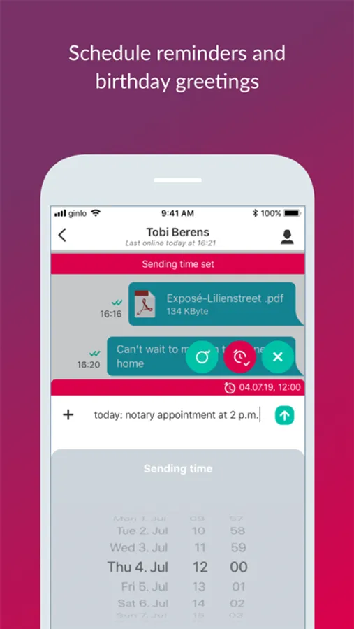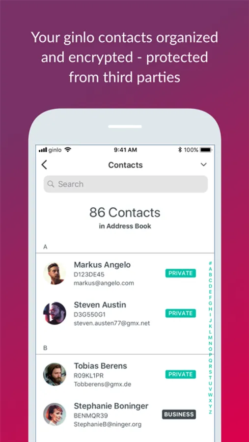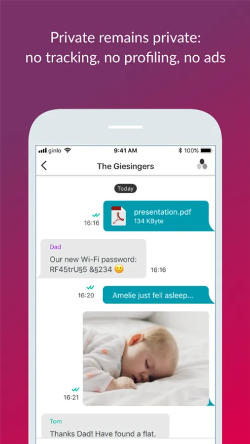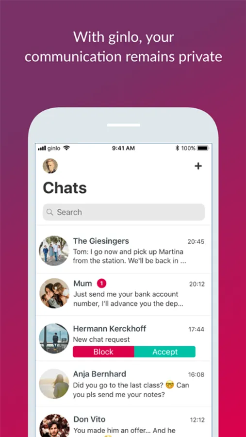 You should decide to whom you entrust really important things. ginlo protects you and the most valuable things you have. Don't worry about the security and privacy of any product, just add ginlo to your device. ginlo is very easy to use and can be used even by the youngest. No age limit - it's that safe.