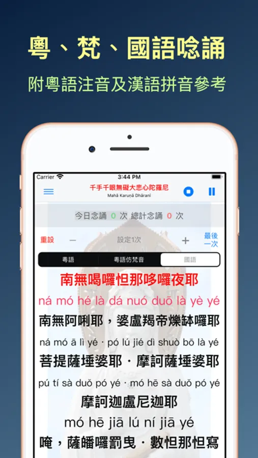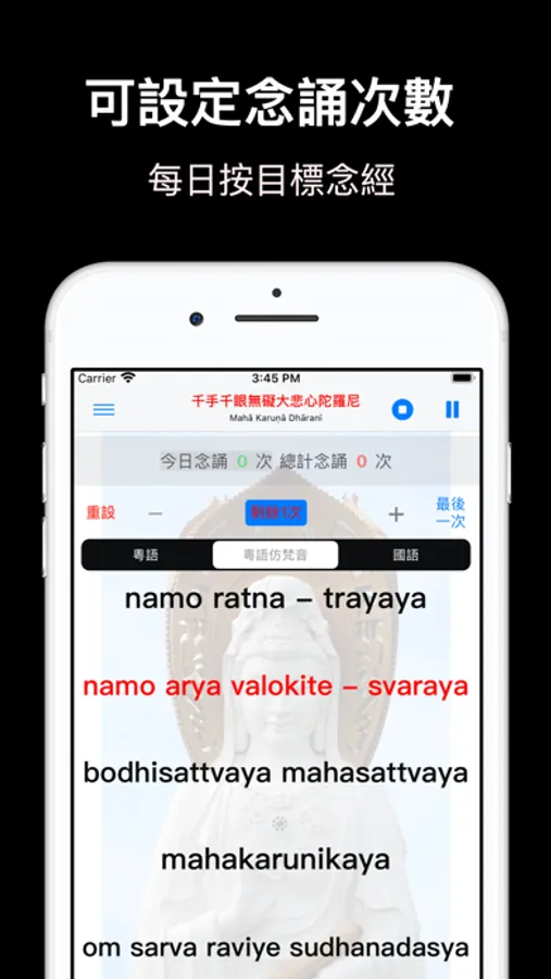 「粵語大悲咒」介面右上角的三角形鍵是播放及暫停鍵,圓形是停止播放鍵。在播放期間不能設定念咒次數,但可以重設念咒次數。