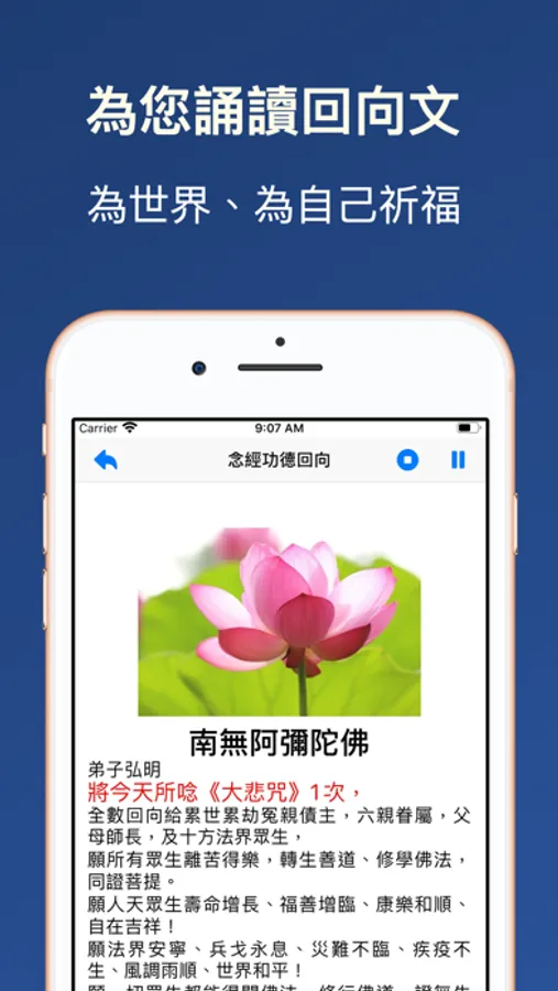 本程式提供背景播放功能,「粵語大悲咒」程式可以在您關閉屏幕下繼續念誦咒文而不會中斷。