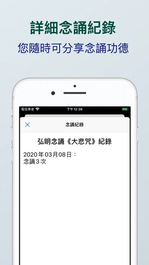 本程式自動紀錄每日念誦不同咒的次數,供日後參考及回向,可以在主頁面底部查閱過往念誦的紀錄,並均設附帶回向文的分享功能,歡迎您與好友分享。