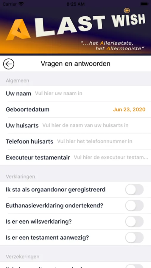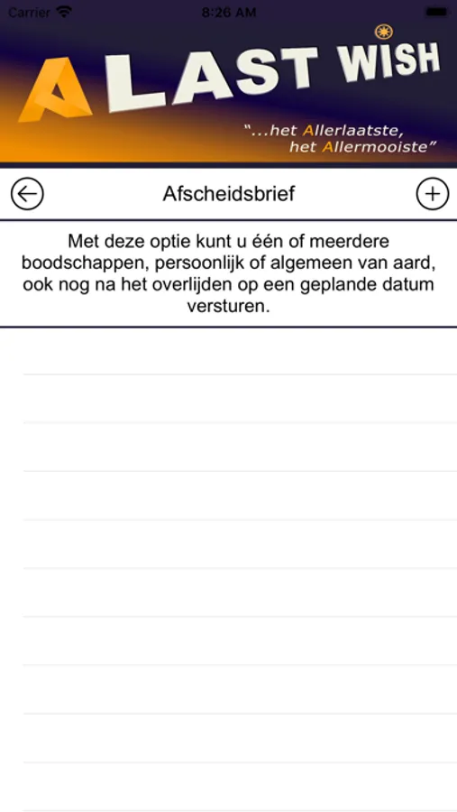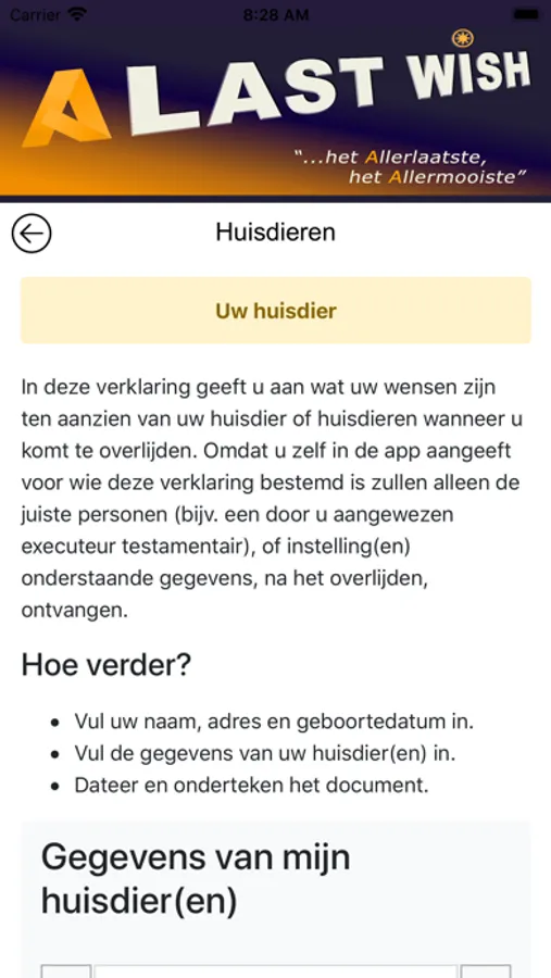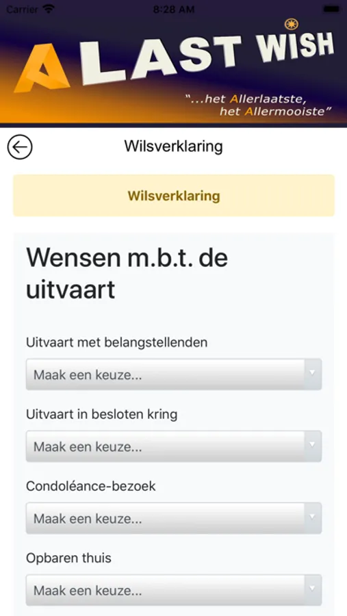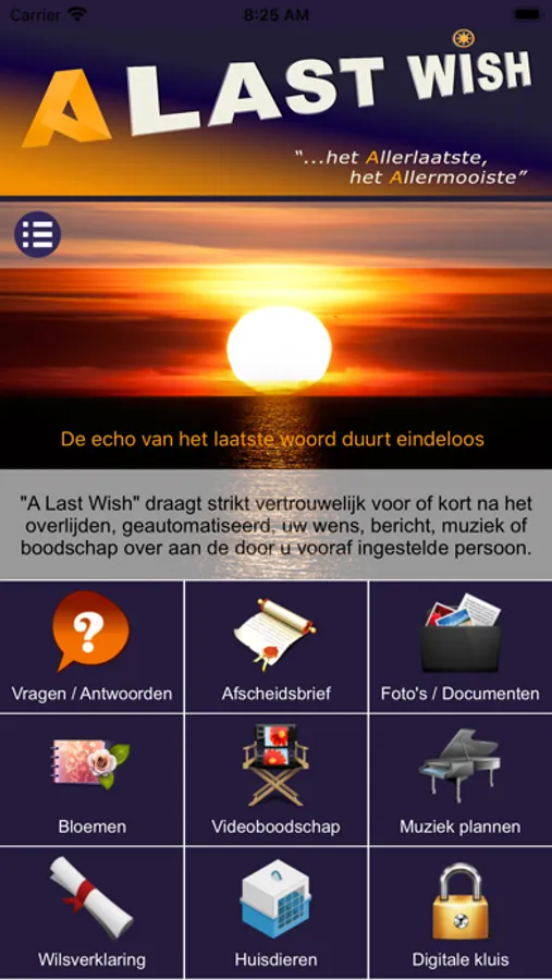 De app ‘A Last Wish’ is uniek en baanbrekend! De app is, volledig geautomatiseerd, in staat om wensen, voorkeuren of berichten, na het overlijden, gericht te versturen of af te leveren.