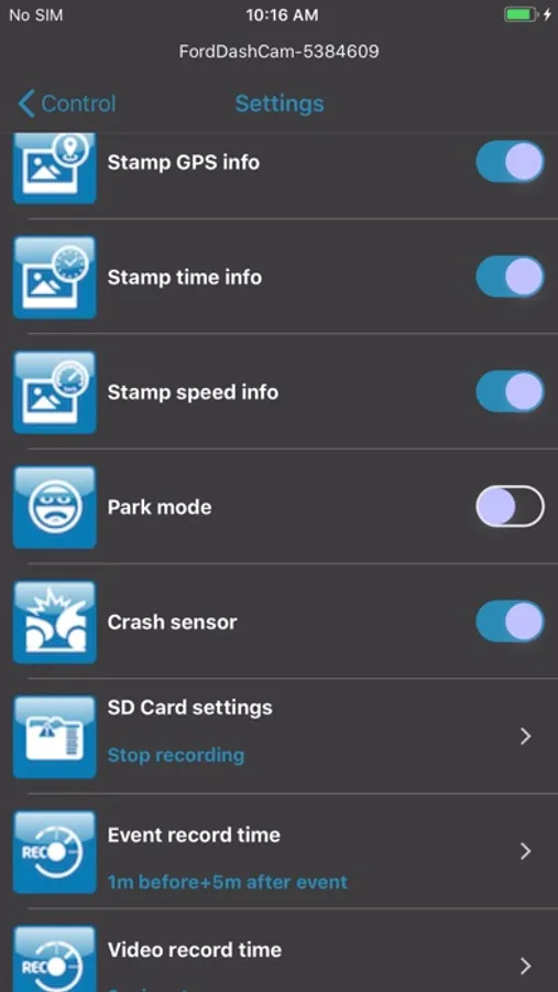 Adjust the Ford DashCam settings (e.g. video resolution, GPS enabling/disabling, Wi-Fi, etc.).