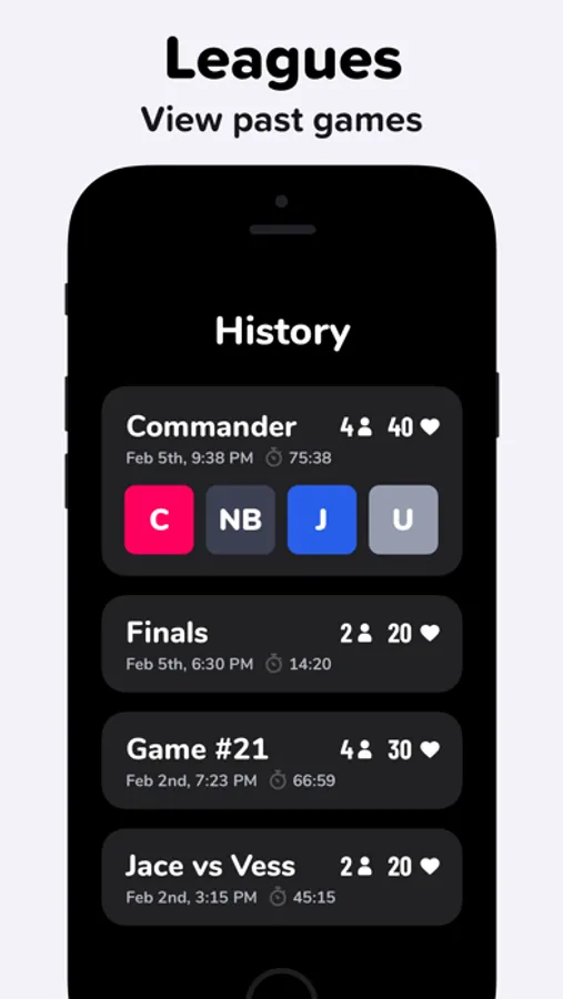 Lotus keeps a record of all the games you played. See when, how long, and who played against. Lotus provides you detailed information on your past games. You can later check-in which round each player has lost or gained life, or added Poison, Energy, Storm, or Experience.