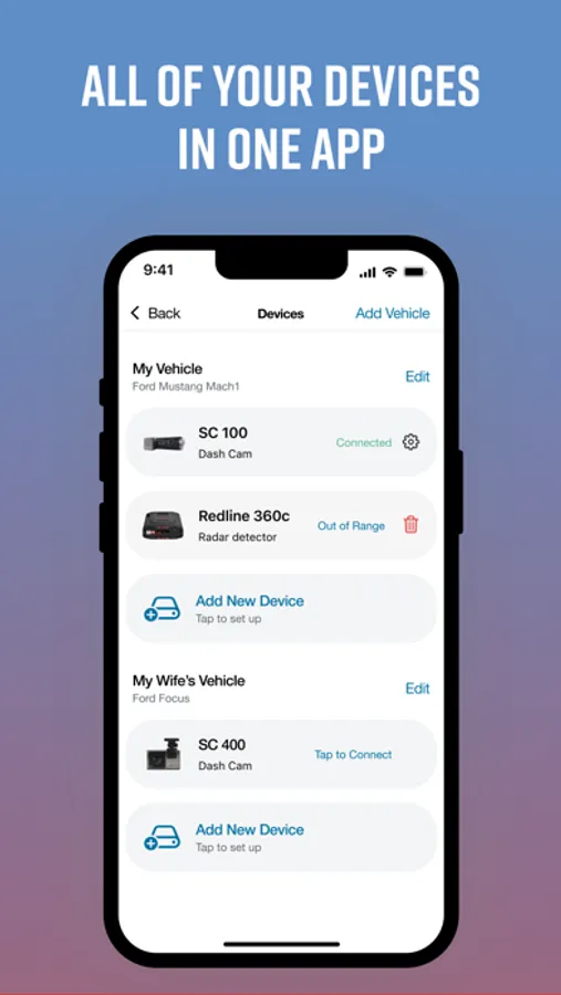 A streamlined onboarding process lets you quickly connect your Dash Cam and configure it as part of your dashboard. You can "add" a virtual vehicle to your account, then add compatible* Cobra and Escort branded devices to your vehicle.