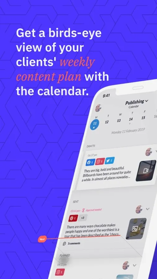 • Get a birds-eye view of your clients' weekly content plan with the calendar.