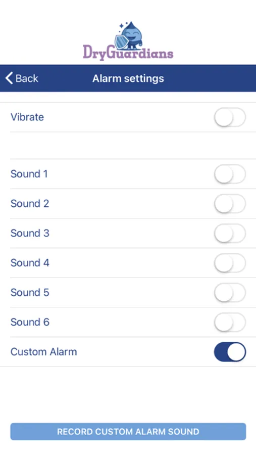 The application gives the user the opportunity to set 6 day alarms to support the child during daytime wetting.