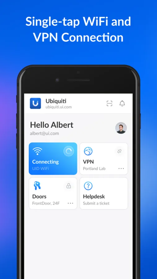 Unlock connected doors by tapping the app’s Door icon, shaking your mobile device, or tapping it against the door’s credential reader. Designated doorkeepers can also interact with visitors via a UA Pro reader and grant access remotely.