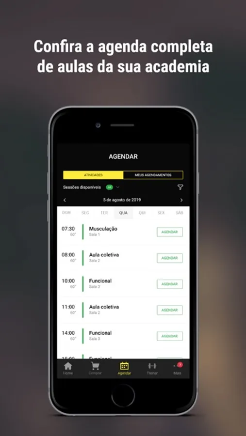- AGENDA: faça check-in, consulte horário, reserve lugar na sala e, se aula que você quer estiver lotada, entre na lista de espera e seja notificado assim que tiver vaga disponível! Tem mais: não consegue ir ao treino? Cancele o agendamento direto pelo HIT ACADEMIA.