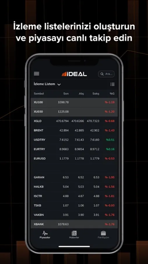 İdeal Mobil, yurt içi ve yurt dışı borsalara ilişkin canlı verileri takip edebilmenizi, piyasalara ve şirketlere dair özel haberlere kolayca ulaşabilmenizi, tüm piyasa işlemlerinizi daha pratik şekilde yapabilmenizi sağlayan bir veri platformudur.