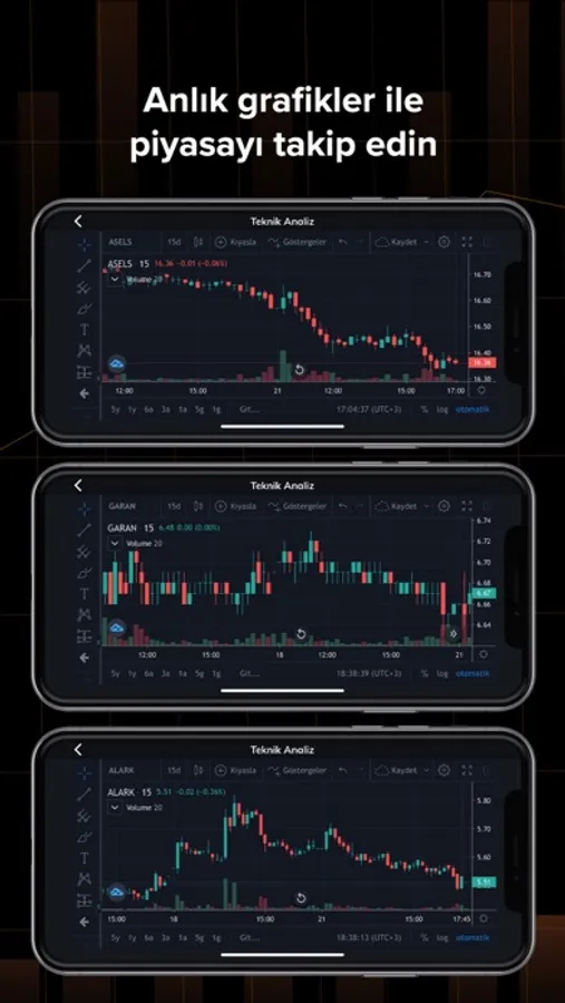 Dilediğiniz enstrümana ilişkin anlık grafikler üzerinden piyasayı takip edebilir, teknik analiz araçlarını kullanabilirsiniz.