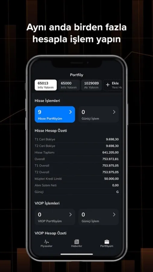 Tüm yatırım hesaplarınızı aynı platform üzerinden yöneterek, aynı anda birden fazla hesabınız ile işlem yapma ayrıcalığını yaşayabilirsiniz.