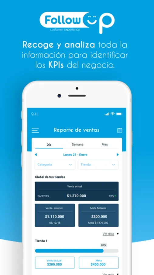 La App de FollowUP te permite visualizar los indicadores de FollowUP Web, en tu celular. Además, agrega una serie de herramientas diseñadas específicamente para apoyar y facilitar la gestión de los equipos de venta.