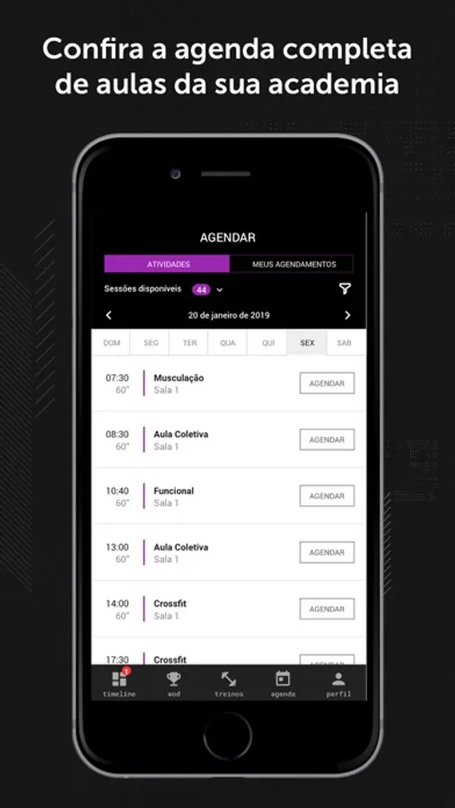 - AGENDA: faça check-in, consulte horário, reserve lugar na sala e, se aula que você quer estiver lotada, entre na lista de espera e seja notificado assim que tiver vaga disponível! Tem mais: não consegue ir ao treino? Cancele o agendamento direto pelo DOT2U.