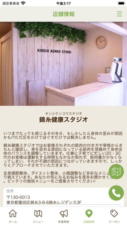 錦糸健康スタジオの公式アプリが登場。アプリを通して『錦糸健康スタジオ』の新着情報やお得な情報をリアルタイムで受け取ることができます。また、いつでもお手元のスマートフォンから、メニューやご希望のお時間帯のチェック・ご予約などが可能です。アプリをインストールしていただくことにより『錦糸健康スタジオ』を、より便利に身近にご利用していただけます。