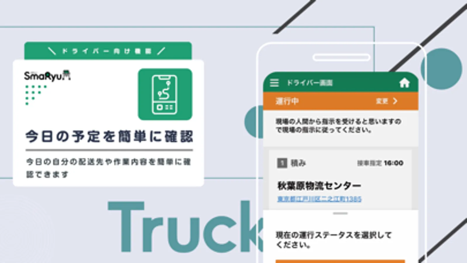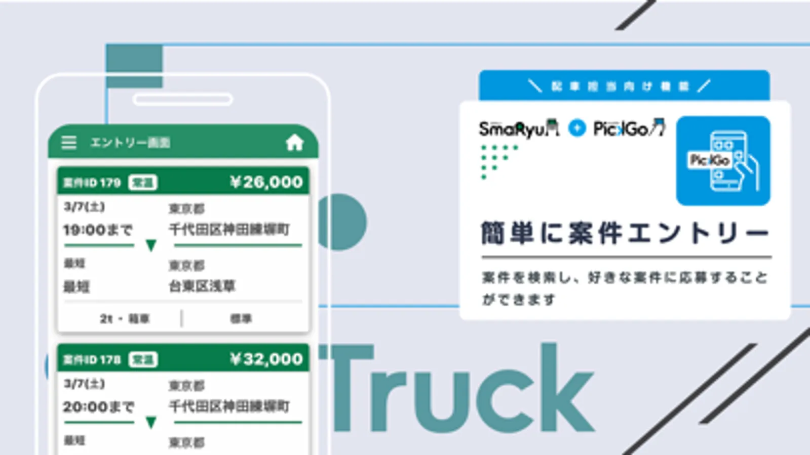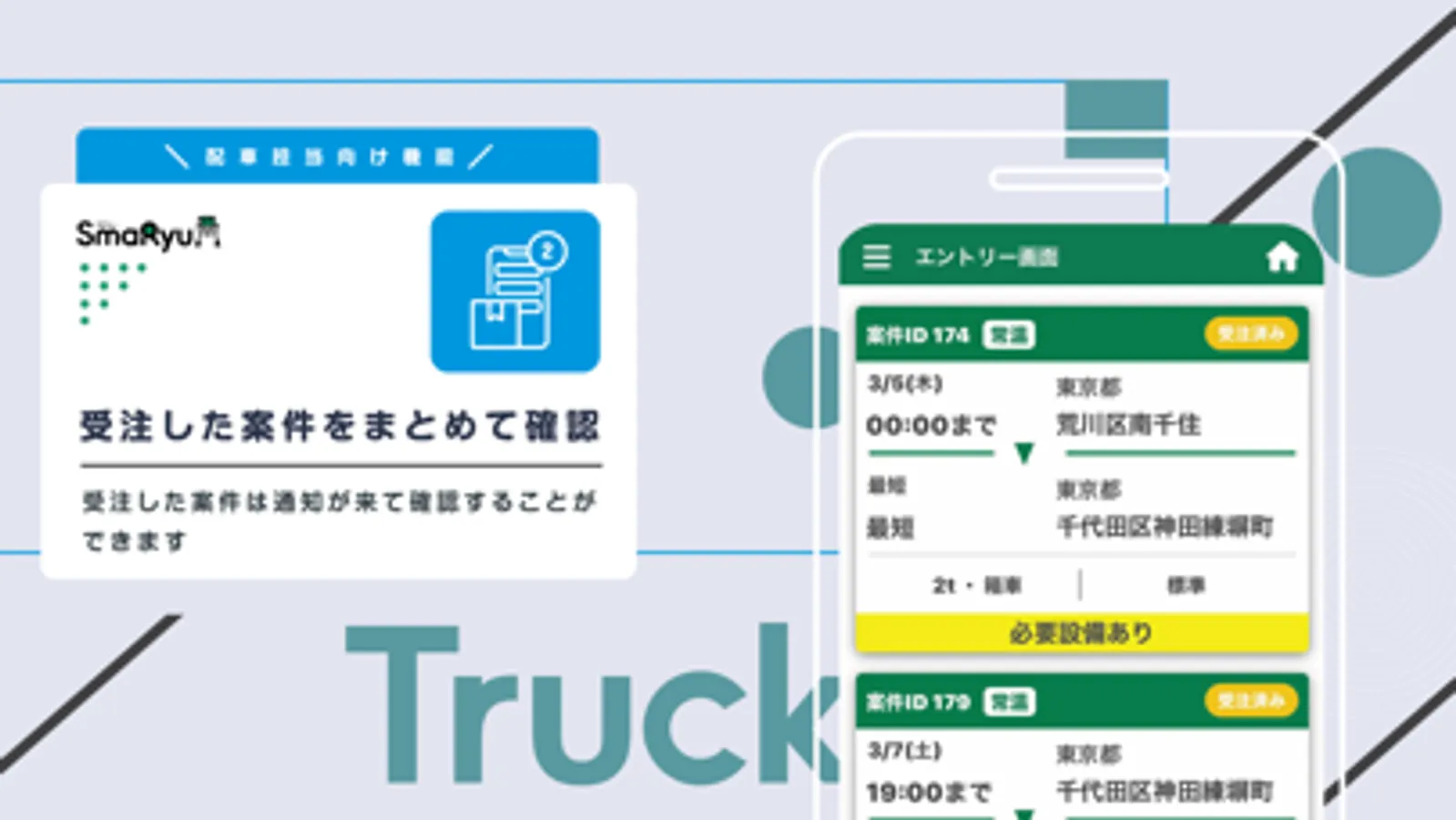 SmaRyu Truckは、配車管理、運行管理、請求業務などを一気通貫で簡単に管理できる運送会社向けクラウド型業務システムです。2t~10tまでの案件にエントリーし、案件の受注状況をリアルタイムに確認することができます。