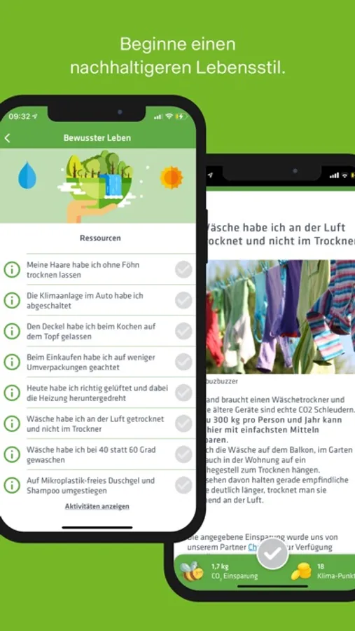 • Erfasse deine Aktivitäten in verschiedenen Lebensbereichen wie Radfahren, Laufen, ÖPNV, Ernährung sowie Nachhaltigkeit und sammle Klima-Punkte für deine CO2-Einsparung