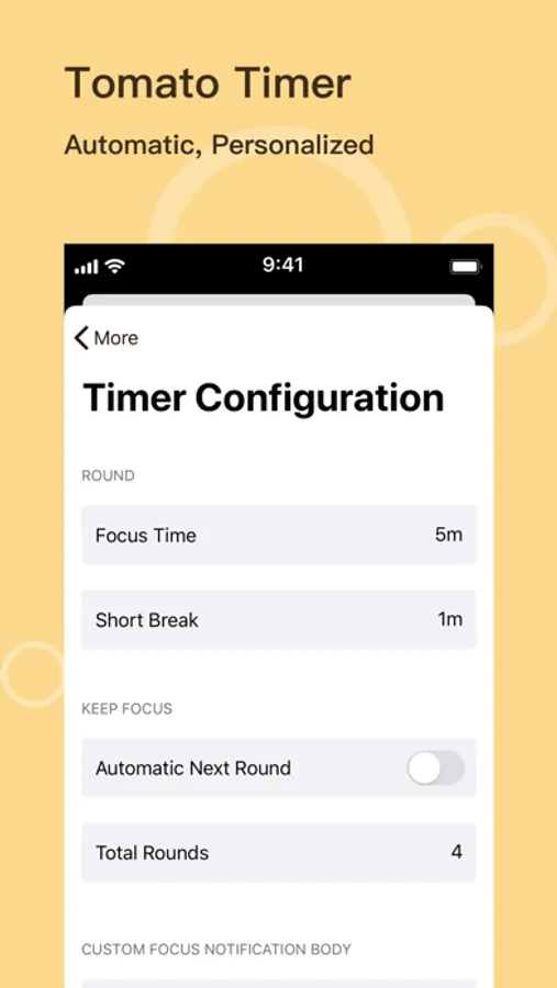 - Free to setup the time for focus, break and number of rounds
