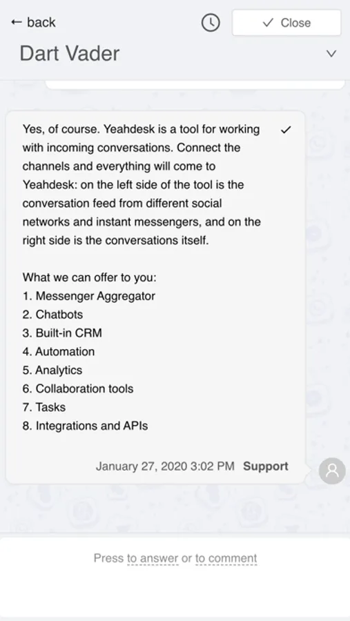 Yeahdesk is a tool for customer support which helps you to manage conversations from messengers, social networks and emails. Distribute, auto reply, collect user data and make your customer happy. You can start free right after registration and without any training cause Yeahdesk looks like a regular messenger.